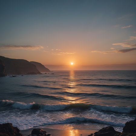 A captivating coastal scene featuring gentle waves lapping against a rocky shoreline, framed by lush cliffs and a tranquil sky, offering a perfect escape into nature.