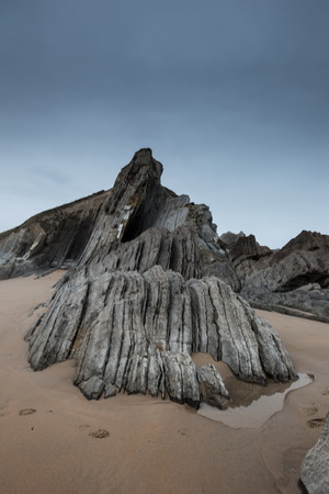 Explore a tranquil coastal scene featuring dramatic rocky outcrops and expansive sandy beaches. This serene landscape captures the beauty of nature at dawn.