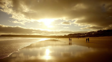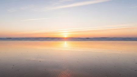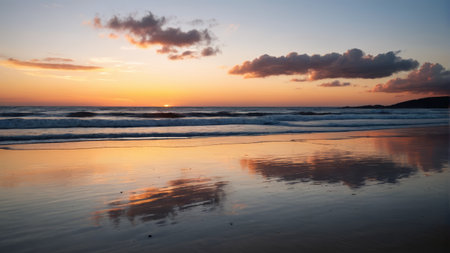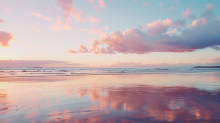 A beautiful sunset over a beach where the clouds are reflected in the calm waters, creating a stunning natural landscape with a fluid atmosphere AIG50
