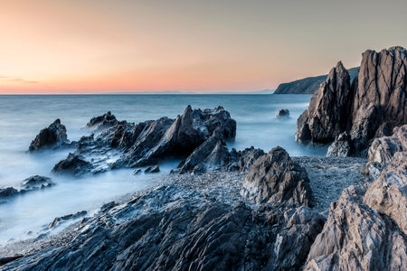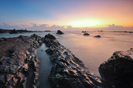 Long exposure shot of seascape at dawn.