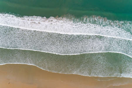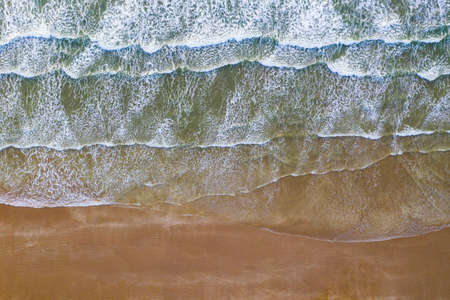 Sea and beach aerial view. Foaming waves crash against a sandy beac