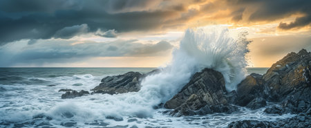 Dramatic ocean waves splash against rocks under a cloudy sunset, showcasing nature's raw power