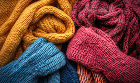 Multi colored woolen garments woven with intricate patterns for winter fashion generated by artificial intelligence