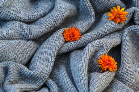 background of knitted gray linen of goat's wool made with knitting needles or on a knitting machine laid in waves with orange chrysanthemum flower.
