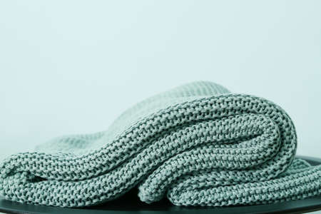 Wavy folds material. Knitted warm grey sweater or scaf. Cozy composition in the home atrosphere. Wool fabric texture close up background. Comfortable style cloth. Soft focus