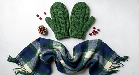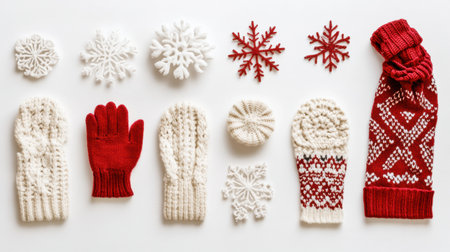 Colorful winter accessories like red and cream gloves and scarves are arranged with delicate snowflakes, inviting cozy seasonal vibes.