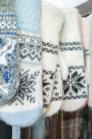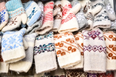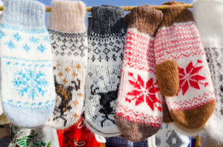 Close up of different hand made wool gloves for cold winter season at the market.