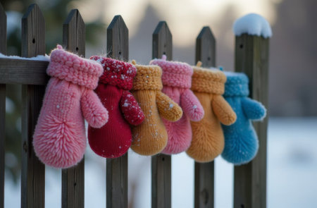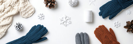 Winter accessories like colorful gloves and a scarf are arranged around snowflakes, creating a cozy seasonal display ideal for chilly days.
