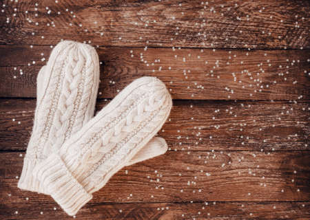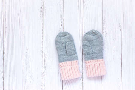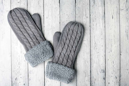 Pair of female hand mittens on wooden background. Woman white woolen knitted gloves on old wooden background, copy space.