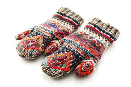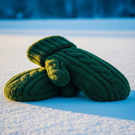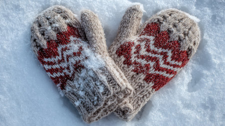 Knitted red mittens resting on soft snow, highlighting unique patterns and textures, perfect for winter fashion, warmth, and seasonal celebrations