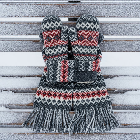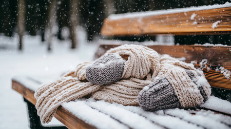 Cozy knitted scarf and gloves resting on a snowy wooden bench in a quiet winter park