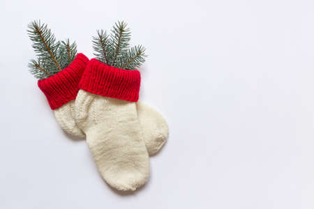 Handmade white warn Christmas socks with red decor and natural fir evergreen branches on white backgound. Photo with blank space.