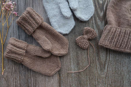 Knitted hats and mittens on a wooden background, top view
