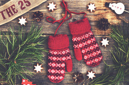 Winter decoration with red knitted mittens, pine tree twigs, christmas toys and gingerbread cookies