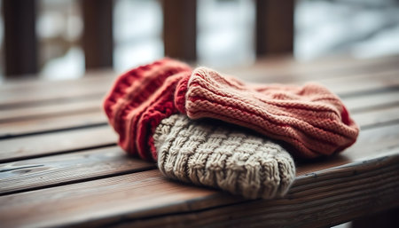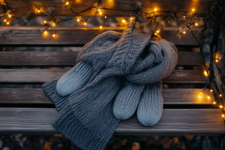 Cozy winter accessories draped on a wooden bench surrounded by twinkling lights during the evening