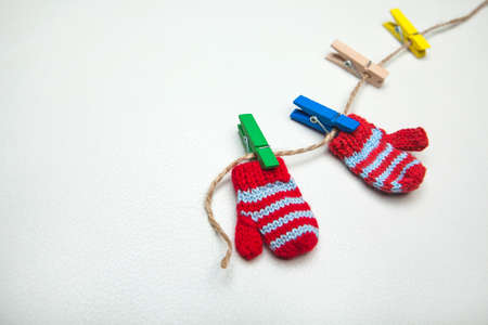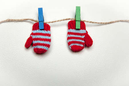winter gloves clothespin rope leather background