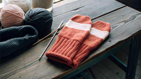 Close-up of hand-knitted mittens with yarn and needles on a rustic wooden table.