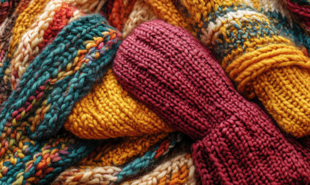 Colorful knitted gloves and scarves in warm shades