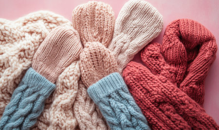 Soft knitted clothes in warm colors, laid out on a pastel background