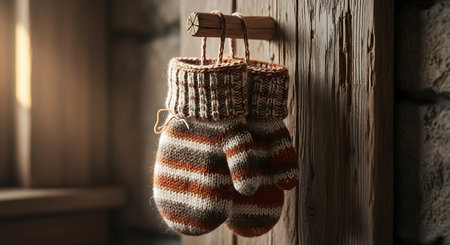 A matching set of thick, intricately patterned wool mittens and a long scarf rest on an old, snow-co
