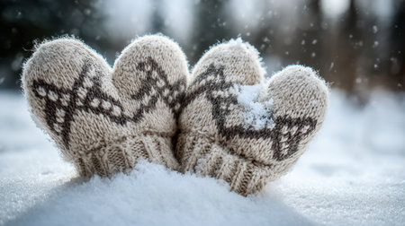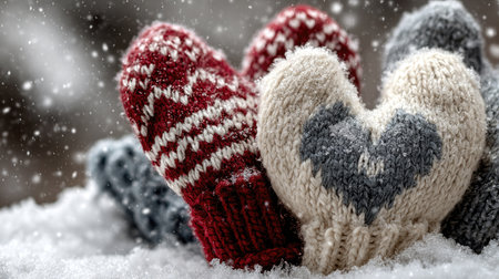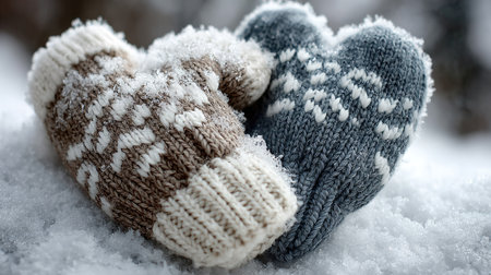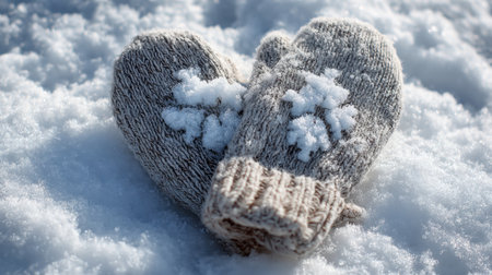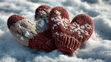 A pair of cozy handknitted mittens with a heart pattern rests on a blanket of snow, showcasing winter charm and warmth in a serene outdoor setting.