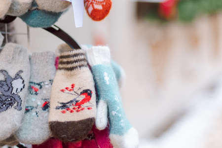 Mittens on the winter Christmas market. Multi-colored knitted woolen mittens.