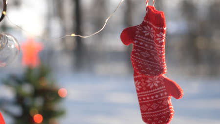 Red wool gloves with a pattern and garland hanging on a leash. Wintertime, winter forest concept. Red mittens hanging on a branch in winter forest. Selective focus.