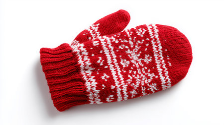 A bright red Christmas mitten with charming snowflakes on a white background.