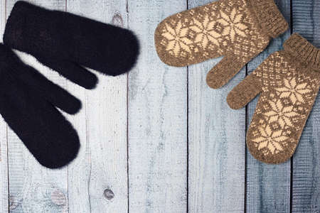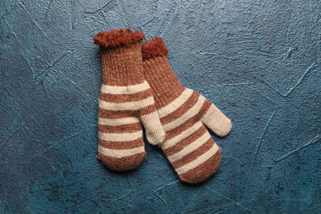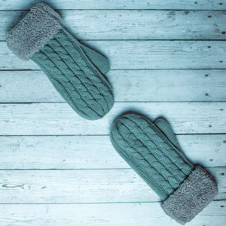 Warm woolen winter mittens on a colored wooden background. Top view, flat lay.