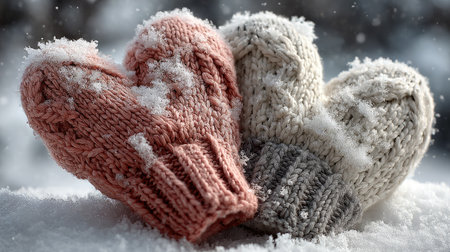 A pair of cozy handmade mittens in heart shapes resting on fresh snow, showcasing intricate patterns and textures perfect for winter outdoor activities.