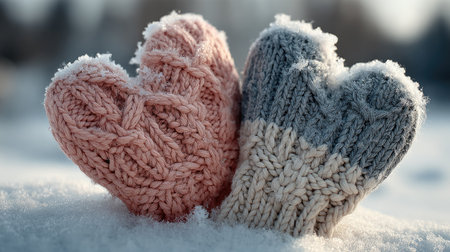 Two heart-shaped knitted mittens in pink and gray sit in a snowy landscape, showcasing intricate patterns and frost. A perfect symbol of warmth and love in winter.