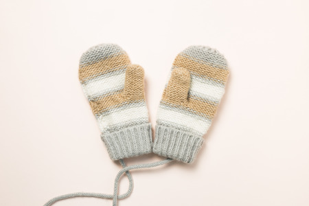 Pair of winter mittens on a light wooden background. Flat lay, top view. High quality photo