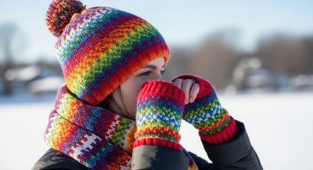 Young caucasian female in colorful winter attire in snowy landscape
