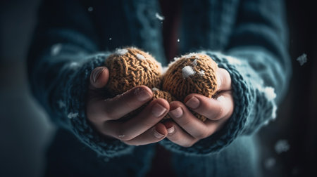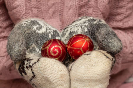 Hands of a woman holding knitted christmas balls in winter.generative ai
