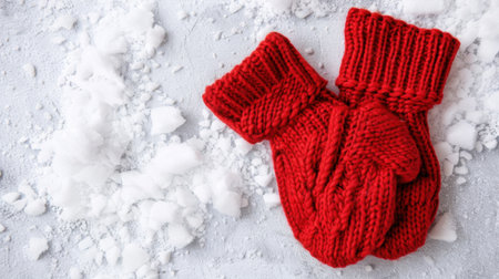A pair of cozy red mittens sits on a snowy surface, symbolizing warmth and comfort during the cold winter months. Perfect for festive themes.