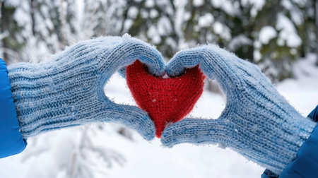 Two hands wearing blue knit gloves create a heart shape using a red yarn heart, set against a snowy winter background, conveying love and warmth.