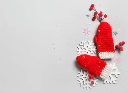 Beautiful mittens, berries and snowflakes on light background