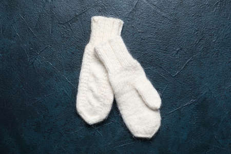 Pair of knitted mittens on dark color background