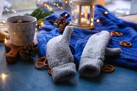 Warm gloves, sweater and cup of tea on table