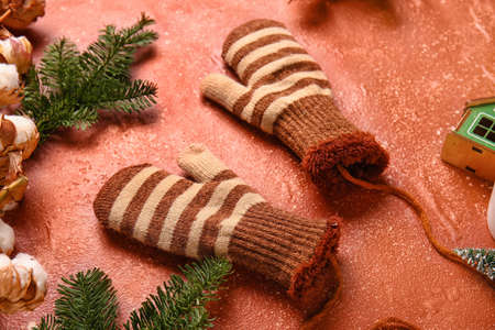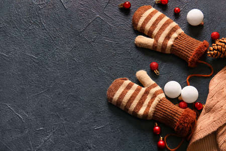 Warm gloves and Christmas decor on black background