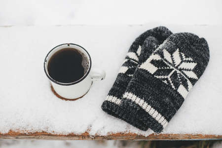 Warm cup of tea and cozy knitted mittens in snow on wooden bench in winter park. Hiking and traveling in cold season. Wanderlust. Space for text. Winter time