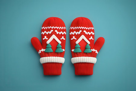 Red mittens with christmas tree on blue background. Top view