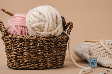 A woven basket with white and gray thread for knitting and knitting needles. White sweaters and yarn for knitting closeup.