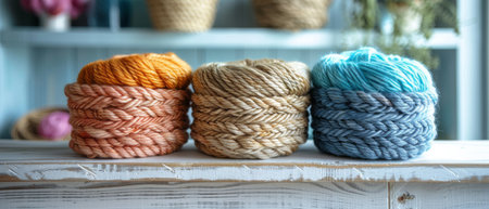 Threads for knitting, from natural environmentally friendly wool, close-up on a light background. Hobby home needlework