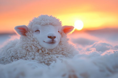 A close-up of an adorable fluffy sheep with closed eyes, exuding tranquility and innocence. Its woolly coat showcases the beauty of farm life.