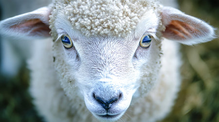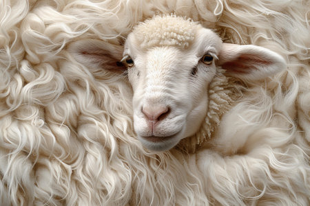 This close-up image captures the serene beauty of a delicate white sheep. The soft wool and peaceful expression create a tranquil atmosphere, perfect for nature-themed projects.