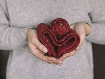 Woman with knitted socks and ball of yarn in her hands. Concept for handmade and hygge slow life.