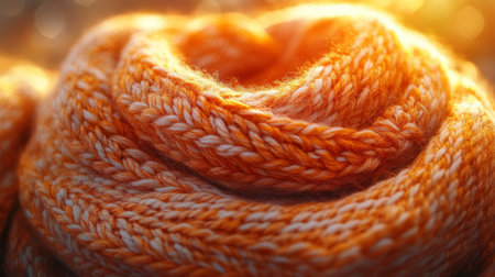 Warm orange knitted fabric illuminated by soft golden sunlight