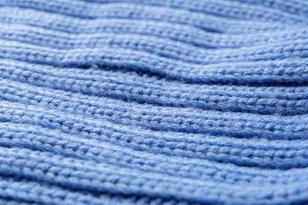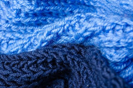 Blue knitted fabric closeup. Knitted wool background. Handmade. Macro.