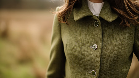 A woman with a beige manicure on her nails is wearing a warm brown cozy jacket in the cold autumn time. Fashion in autumn. Nice casual women's clothing.
